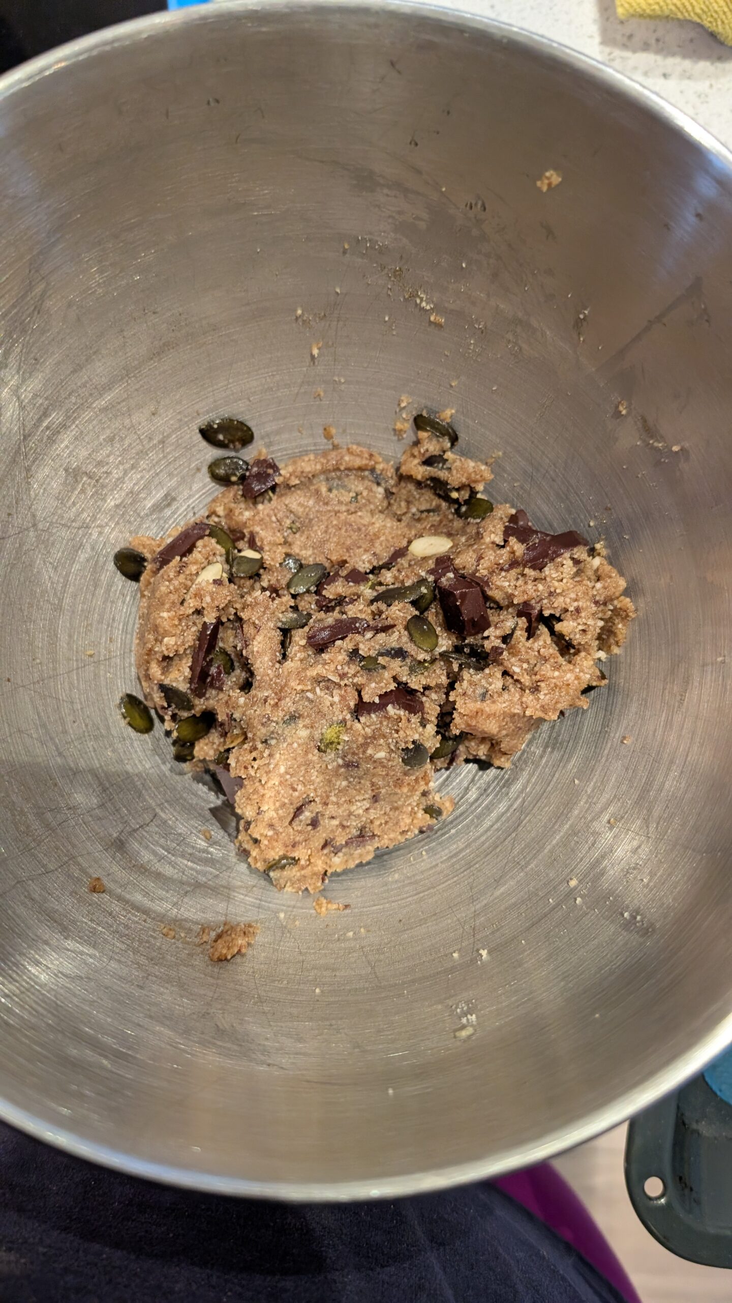 - Stir in the almond flour, pumpkin seeds, chopped chocolate and sea salt until they come together into a cookie dough.