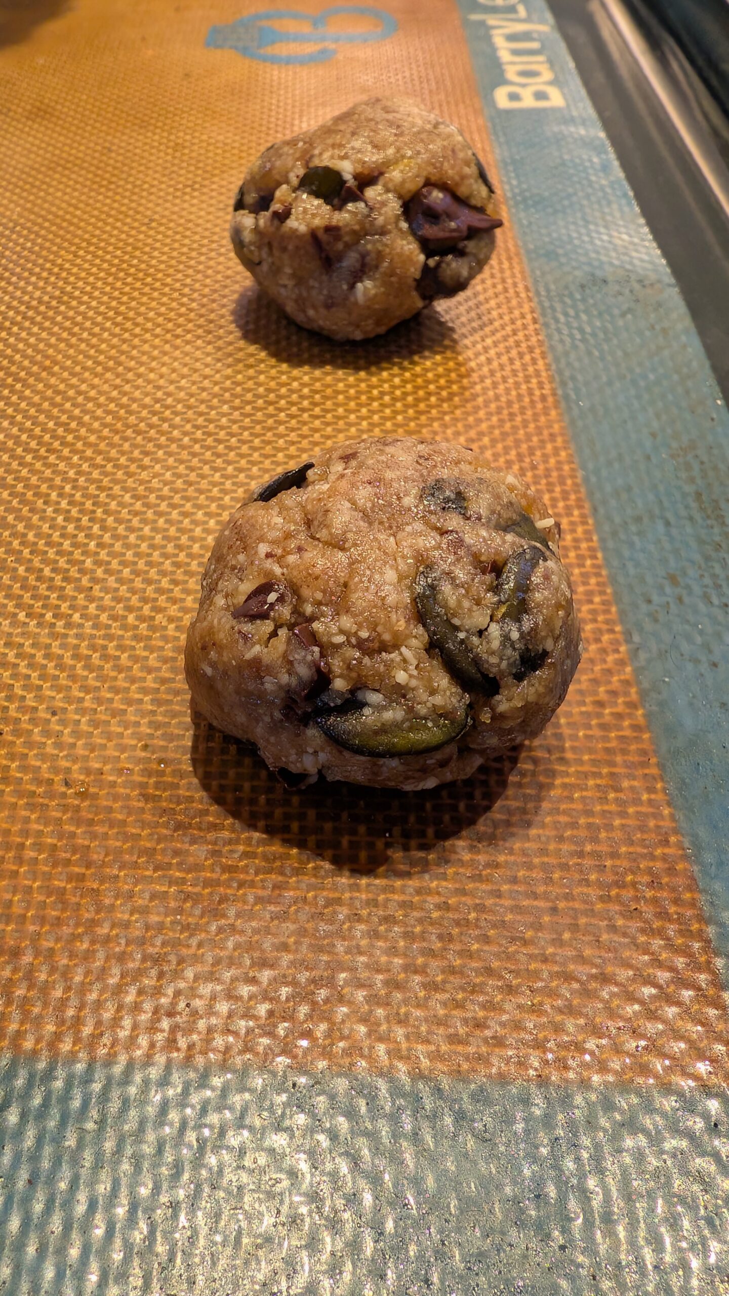 - Form into 12 balls and use damp hands to flatten down on a cookie sheet covered in parchment paper or a silicon mat.